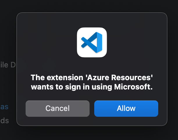 Ein Dialogfenster erscheint mit dem Hinweis, dass die Erweiterung "Azure Resources" sich anmelden möchte. Klicke auf Allow, um den Login-Prozess zu starten.