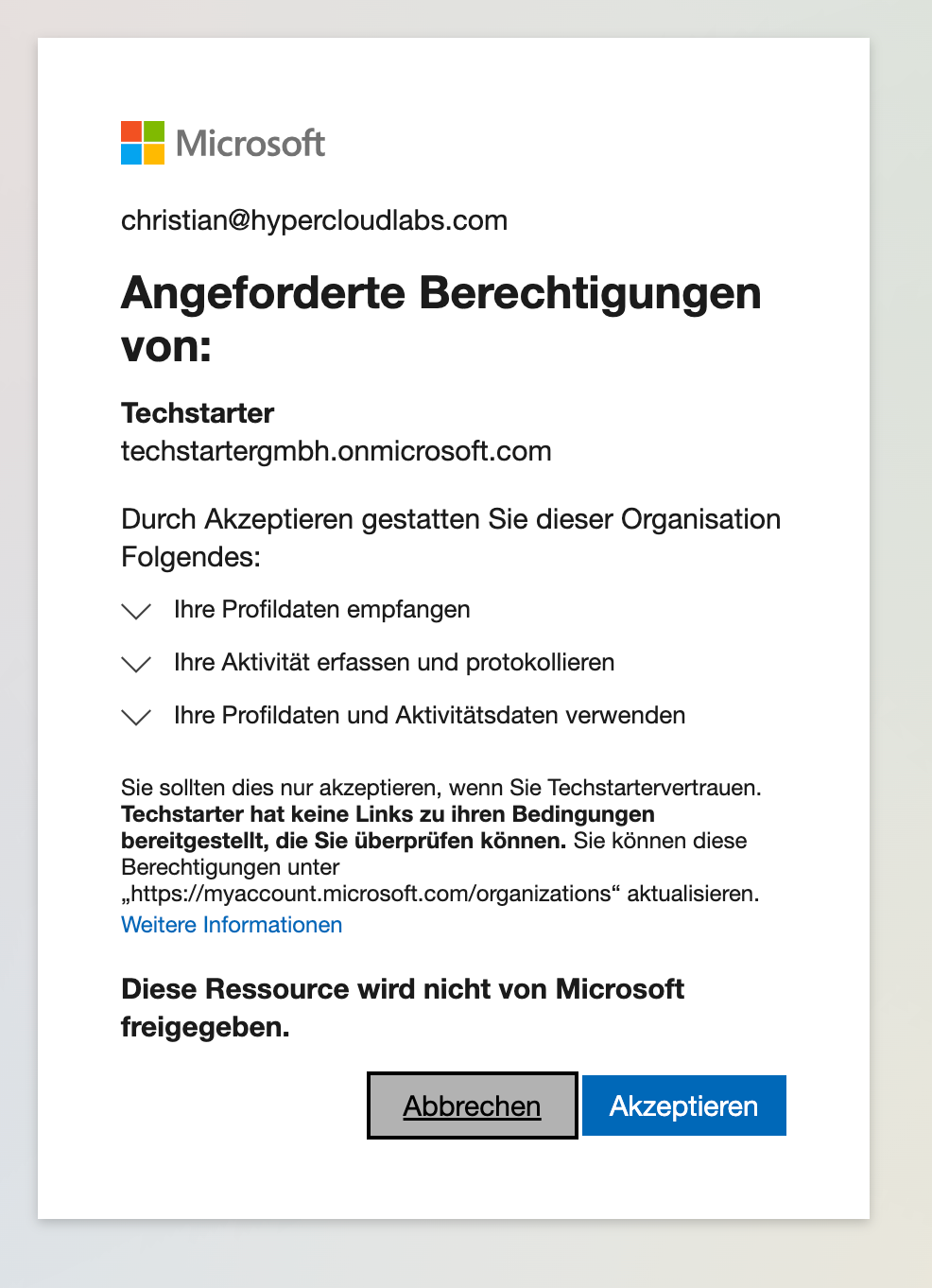 - Du wirst um die Zustimmung für die Berechtigungen gebeten, die